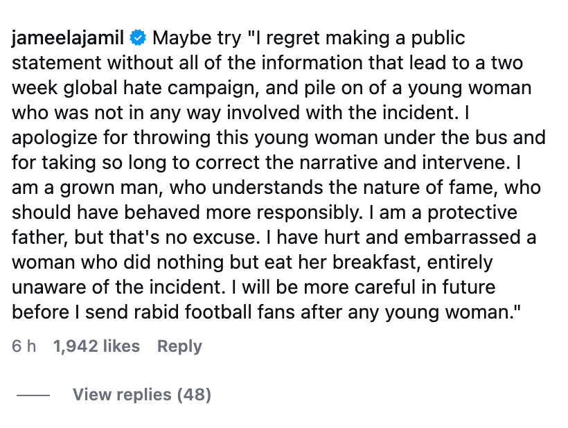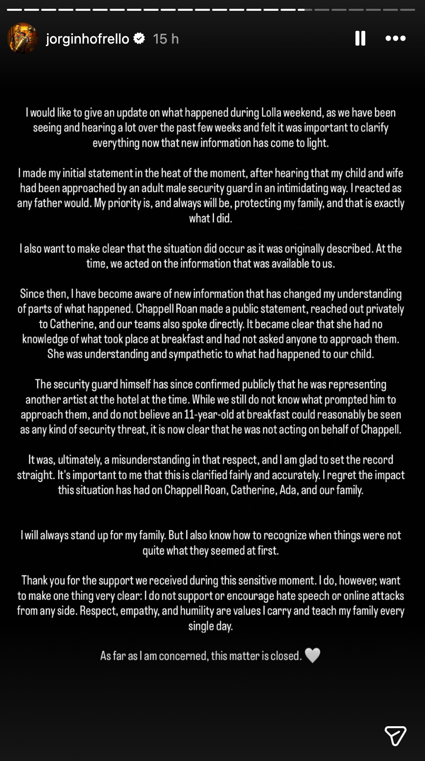 “Maybe try ‘I regret making a public statement without all of the information that lead to a two week global hate campaign, and pile on of a young woman who was not in any way involved with the incident,’” wrote Jameela Jamil. As a Celebrity Reporter, I cover everything from fashion and award shows to TV, film, and cultural conversations. The alleged incident occurred at a hotel in São Paulo, where they were all staying for the Lollapalooza festival. Jorginho claimed that his stepdaughter walked past Chappell’s breakfast table, looked to confirm that she’d seen the singer, and smiled before returning to sit with her mom, when a “large security guard” approached their table and berated the child. Jorginho said that the 11-year-old was left “extremely shaken” and in tears, before writing to Chappell directly: “WITHOUT YOUR FANS, YOU WOULD BE NOTHING. AND TO THE FANS, SHE DOES NOT DESERVE YOUR AFFECTION.” Chappell Roan responds to the controversy involving a security guard confronting a young fan. pic.twitter.com/i3bNx7b9FS “I am sorry to the mother and child that someone was assuming that you would do something, and if you felt uncomfortable. That makes me really sad. You did not deserve that,” she added. Catherine then addressed Chappell’s response, stating in part, “I think that you have a responsibility when you are a celebrity to make sure that the people that work for you and that act on your behalf are acting on your behalf.” You can read a full breakdown of her statement here. “The security guard himself has since confirmed publicly that he was representing another artist at the hotel at the time,” he wrote. “While we still do not know what prompted him to approach them, and do not believe an 11-year-old at breakfast could reasonably be seen as any kind of security threat, it is now clear that he was not acting on behalf of Chappell.” The athlete concluded by thanking his fans for their support, before noting that he does not condone “hate speech or online attacks from any side.”