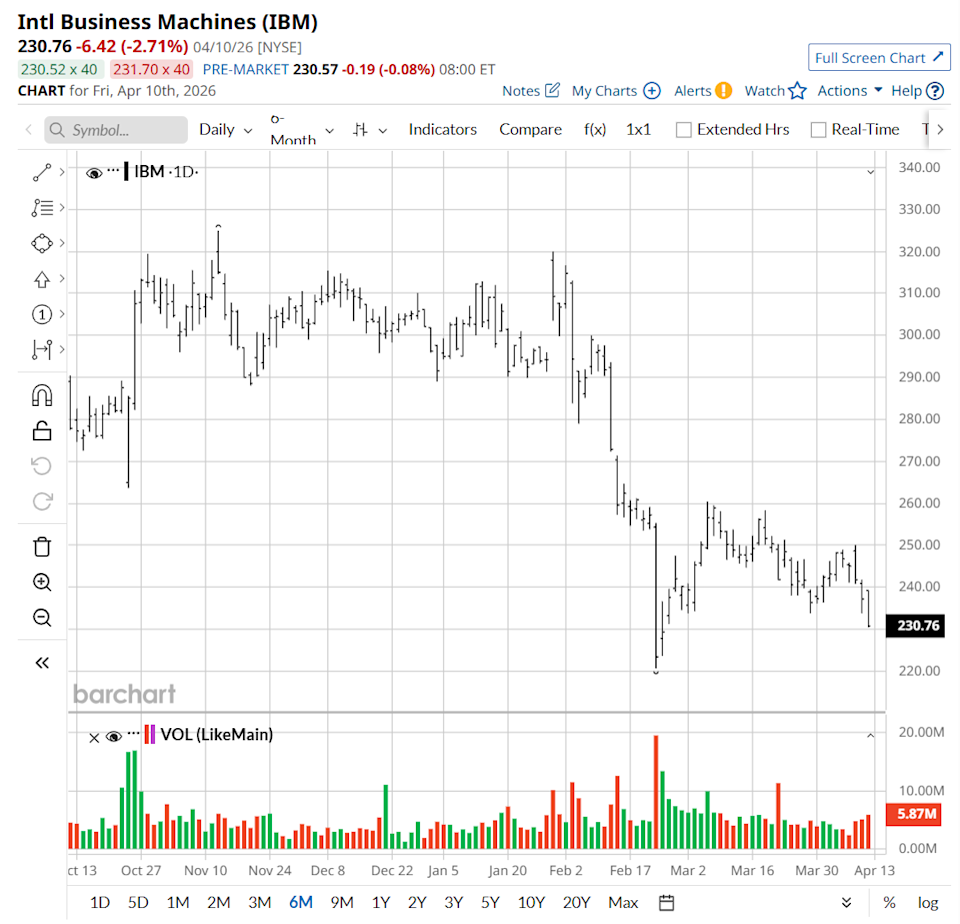The above button links to Coinbase. Yahoo Finance is not a broker-dealer or investment adviser and does not offer securities or cryptocurrencies for sale or facilitate trading. Coinbase pays us for certain activity generated through this link. Prices displayed are informational. Investors looking to add AI exposure to their portfolio received another trade idea when Citi initiated coverage on International Business Machines (IBM). The research firm cited attractive valuation, acquisition synergies, and artificial intelligence tailwinds as the major reasons for its “Buy” rating and $285 price target. Citi pointed out that IBM has minimal capital intensity exposure to AI demand while being in a position to build the next leg of enterprise AI systems. This unique position is mainly a result of the company’s existing presence in some of the most complex enterprise IT systems in the world, giving it a strong defensive position in a growing industry. Analysts Hike Their Micron Estimates, Pushing MU Stock Price Targets Higher Stocks Recover as Oracle Leads Software Companies Higher Dear CoreWeave Stock Fans, Mark Your Calendars for April 14 Tired of missing midday reversals? The FREE Barchart Brief newsletter keeps you in the know. Sign up now! The company’s acquisition strategy is also going well. Recent acquisitions of HashiCorp in 2025 and Confluent earlier this year allow IBM to build a data nervous system that will power agentic AI through real-time data streaming. This is in addition to the firm’s long-term potential in quantum computing. Founded in 1911, IBM operates as an integrated solutions and services provider. The company operates through its Financing, Consulting, Software, and Infrastructure segments, offering hybrid cloud and AI platforms, strategy and technology services, on-premises and cloud-based servers and storage solutions, client and commercial financing, and more. IBM stock has underperformed the broader market over the last year. While the S&P 500 Index ($SPX) has delivered returns of around 28% over the past 52 weeks, IBM stock has gained less than 1% over the same period. The S&P 500 outperforming IBM across multiple time frames highlights weaker momentum in the stock. The problem with IBM has mostly been its lackluster growth. Estimated earnings growth of 7% in 2026 hardly inspires investors. The 2027 consensus growth rate of 8% doesn’t impress, either. However, this is exactly what makes IBM a great defensive AI bet according to Citi. IBM stock’s forward price-to-earnings (P/E) ratio of 18.6 times is now similar to the broader market and below its own five-year average. When coupled with the scope of healthy upward revisions in earnings and free cash flow on the back of AI opportunities, the valuation is enticing. IBM reported fourth-quarter earnings on Jan. 28. The company posted revenue growth of 9% in Q4 to $19.7 billion. Annual recurring revenue came in at $23.6 billion, increasing by more than $2 billion versus the end of 2024. Software was the main growth driver during the quarter with revenue rising 11%. This was supported by strong performance in automation, which rose 14%, and data, which grew 19%. The consulting segment also recorded a modest 1% increase, while infrastructure rose 17% year-over-year (YOY). At the end of 2025, IBM had $14.5 billion in cash. For 2026, management expects more than 5% revenue growth on a constant currency basis. Free cash flows are also projected to increase by approximately $1 billion. The software segment is anticipated to be the main driver again, growing by around 10%. Additionally, the infrastructure segment may see a slight decline, while the consulting segment is expected to rise in the low- to mid-single digits. IBM is also targeting an additional $1 billion in productivity savings. Ahead of the company's Q1 earnings report on April 22, Stifel analyst David Grossman cut the firm’s price target on IBM stock from $340 to $290. However, the analyst maintained a “Buy” rating. The price target revision reflects updated 2026 estimates, taking into account potential headwinds from the Iran war as well as software and services growth. At the same time, the outlook also includes a positive factor from the Confluent acquisition, which may close earlier than previously expected. IBM stock has a consensus “Moderate Buy” rating based on 22 analysts with coverage on Wall Street. The consensus rating shows that analysts are optimistic about the stock, despite an unimpressive recent performance. IBM has a mean price target of $311.29, offering 30% potential upside from current levels. On the date of publication, Jabran Kundi did not have (either directly or indirectly) positions in any of the securities mentioned in this article. All information and data in this article is solely for informational purposes. This article was originally published on Barchart.com