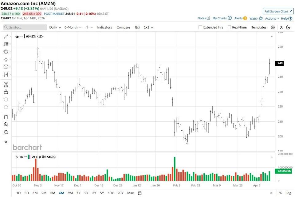 The above button links to Coinbase. Yahoo Finance is not a broker-dealer or investment adviser and does not offer securities or cryptocurrencies for sale or facilitate trading. Coinbase pays us for certain activity generated through this link. Prices displayed are informational. Amazon (AMZN) shares rallied on April 14 after the tech titan announced a definitive $11.6 billion agreement to acquire Covington-headquartered satellite connectivity firm Globalstar (GSAT). The bullish momentum drove AMZN’s relative strength index (14-day) into the mid-70s, signaling “overbought” conditions that often precede a sharp correction. Analysts Hike Their Micron Estimates, Pushing MU Stock Price Targets Higher How to Buy Nvidia Stock for a 27% Discount or Achieve an 8% Annual Return Heavy, Unusual Volume in Amazon Options Ahead of Earnings in Two Weeks Markets move fast. Keep up by reading our FREE midday Barchart Brief newsletter for exclusive charts, analysis, and headlines. Following today’s surge, Amazon stock is up roughly 8% versus the start of this year. The acquisition of Globalstar is a strategic “masterstroke” that transforms Amazon from a satellite aspirant into a functional Direct-to-Device (D2D) leader. By absorbing GSAT’s established satellite fleet and licensed S-band spectrum, AMZN effectively bypasses years of regulatory hurdles and FCC deployment deadlines. Furthermore, a concurrent agreement with Apple (AAPL) ensures the Nasdaq-listed giant will now power the satellite SOS and messaging features for millions of iPhones and Apple Watches. This vertical integration is bullish for AMZN shares as it doesn't only strengthen the company’s Leo infrastructure, but also secure a high-profile, recurring sales stream from one of the world’s largest tech ecosystems. Goldman Sachs’ senior analyst Eric Sheridan maintained his “Buy” rating on Amazon shares today, with a $275 price target indicating potential upside of about 10% from here. In his research note, Sheridan cited strengthening confidence in AWS revenue growth, which he believes will accelerate into 2026 fueled by AI demand and custom silicon returns. Moreover, the investment firm remains constructive on AMZN’s high-margin advertising segment as well, noting the company is a primary beneficiary of shifting digital budget allocations across the industry. And options traders also seem to agree with Sheridan’s positive stance. The put-to-call ratio on contracts expiring mid-July sits at 0.39 currently, indicating a strong bullish skew, with the upper price on those contracts set at $279 currently. What’s also worth mentioning is that Goldman Sachs is actually among the more conservative Wall Street firms on AMZN stock. The consensus rating on Amazon sits at “Strong Buy” currently, with the mean price target of about $286 indicating potential upside of nearly 15% from here. On the date of publication, Wajeeh Khan did not have (either directly or indirectly) positions in any of the securities mentioned in this article. All information and data in this article is solely for informational purposes. This article was originally published on Barchart.com