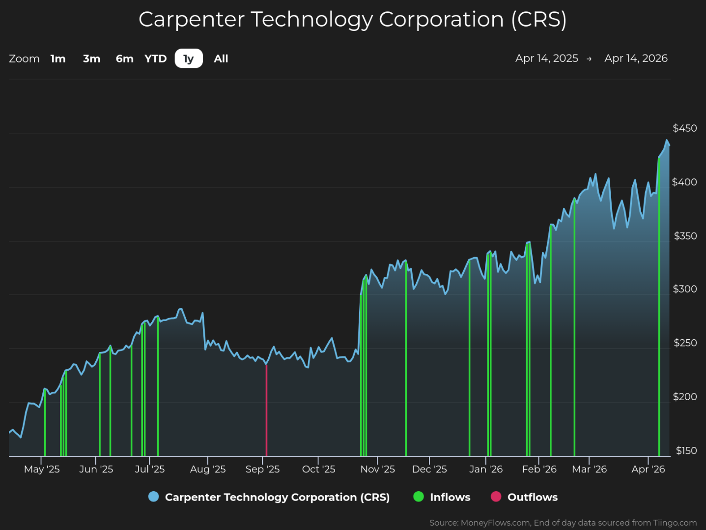 The above button links to Coinbase. Yahoo Finance is not a broker-dealer or investment adviser and does not offer securities or cryptocurrencies for sale or facilitate trading. Coinbase pays us for certain activity generated through this link. Prices displayed are informational. CRS produces and distributes specialty alloys, including titanium, powder metals, stainless steels, alloy steels, tool steels, and drilling tools. Its second-quarter fiscal 2026 earnings report showed adjusted operating income of $155 million (a 31% year-over-year gain), gross profit of $218.3 million (a 23% jump), and adjusted per-share earnings of $2.33. The company next reports on April 29. No wonder CRS shares are up 39% so far this year – and they could rise more. MoneyFlows data shows how Big Money investors are again betting heavily on the stock. Institutional volumes reveal plenty. In the last year, CRS has enjoyed strong investor demand, which we believe to be institutional support. Each green bar signals unusually large volumes in CRS shares. They reflect our proprietary inflow signal, pushing the stock higher: Plenty of materials names are under accumulation right now. But there’s a powerful fundamental story happening with Carpenter Technology. Institutional support and a healthy fundamental backdrop make this company worth investigating. As you can see, CRS has had strong sales and earnings growth: 3-year sales growth rate (+17.1%) 3-year EPS growth rate (+163.2%) Source: FactSet Also, EPS is estimated to ramp higher this year by +18.2%. Now it makes sense why the stock has been generating Big Money interest. CRS has a track record of strong financial performance. Marrying great fundamentals with MoneyFlows software has found some big winning stocks over the long term. Carpenter Technology has been a top-rated stock at MoneyFlows. That means the stock has unusual buy pressure and growing fundamentals. We have a ranking process that showcases stocks like this on a weekly basis. CRS produced 12 rare Outlier 20 inflow signals in the last year. Shares gained 111.9% from the first one in May until now. The blue bars below show when the stock was a top pick…Big Money keeps buying: Tracking unusual volumes reveals the power of money flows. This is a trait that most outlier stocks exhibit…the best of the best. Big Money demand drives stocks upward. The CRS action isn’t new at all. Big Money buying in the shares is signaling to take notice. Given the historical gains in share price and strong fundamentals, this stock could be worth a spot in a diversified portfolio. Disclosure: the author holds no position in CRS at the time of publication. If you are a Registered Investment Advisor (RIA) or are a serious investor, take your investing to the next level and follow our free weekly MoneyFlows insights. This article was originally posted on FX Empire Institutions Keep Pushing Lumentum Higher Further Strength for the Dollar Ahead of the NFP See How Institutions Boost Catalyst Shares See How 12 Huge Inflows Powered Carpenter Technology Higher Markets Wobble After Fruitless Talks AI, Robotics Keep Teradyne Shares in Demand