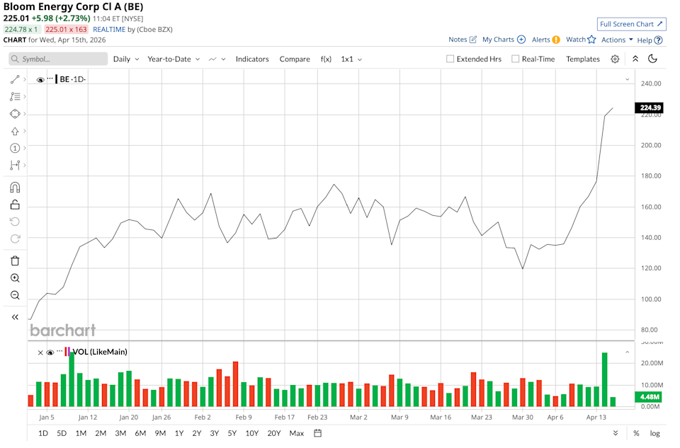 The above button links to Coinbase. Yahoo Finance is not a broker-dealer or investment adviser and does not offer securities or cryptocurrencies for sale or facilitate trading. Coinbase pays us for certain activity generated through this link. Prices displayed are informational. Shares of fuel cell energy services provider Bloom Energy (BE) climbed 24% on April 14 following an announcement that cloud infrastructure major Oracle (ORCL) has extended its partnership with the company. As part of the agreement, Oracle will secure 2.8 gigawatts (GW) of Bloom's fuel cell systems to assist in its AI infrastructure buildout. Commenting on the development, Executive Vice President of Oracle Cloud Infrastructure Mahesh Thiagarajan said, “By rapidly deploying Bloom's reliable, efficient fuel cell energy, we are quickly meeting the demands of our customers across the United States.” Weighing in, Bloom Chief Commercial Officer Aman Joshi remarked, "Together, we are defining a shared vision for the future of energy and AI infrastructure, with Bloom advancing its position as the standard for onsite power." What a New Generation of Traders in Commodities Might Mean For Markets Turbine Season for Tech: John Rowland on the Next Era of AI Data Center Investments Possible US-Iran Ceasefire Extension Knocks Crude Prices Lower Stop Missing Market Moves: Get the FREE Barchart Brief – your midday dose of stock movers, trending sectors, and actionable trade ideas, delivered right to your inbox. Sign Up Now! Founded in 2001 and based in San Jose, California, Bloom Energy designs and sells solid oxide fuel cell (SOFC) systems. Bloom Energy serves end markets such as data centers, utilities, hospitals, telecom, and infrastructure, among others. Valued at a market capitalization of about $59 billion, BE stock is up an impressive 142% on a year-to-date (YTD) basis. So, does Bloom have what it takes to bloom further? Let's take a closer look. Bloom Energy closed 2025 with a bang, marked by record revenues, a sizeable backlog, and rising earnings. The fourth quarter of 2025 saw revenue of $777.7 million, up almost 36% year-over-year (YOY). The product segment — the core revenue segment of the company — witnessed yearly growth of 35% to $638.5 million as Bloom closed the year with a hefty backlog of $20 billion. Meanwhile, diluted EPS remained almost flat at $0.45 per share, compared to $0.43 per share in the year-ago period. However, earnings comfortably outpaced the consensus estimate of $0.31 per share. Net cash from operating activities at $418.1 million saw a slight decline when compared to the prior year's figure of $484.2 million, as a hit to the net profits flowed down into the cash flows. Overall, Bloom Energy closed the quarter with a cash balance of $2.45 billion. The strong financials and the share price rally have come at the cost of punchy valuations for BE stock. Its forward price-to-earnings (P/E), price-to-sales (P/S), and price-to-cash flow (P/CF) ratios of 223 times, 30.3 times, and 548.4 times are all trading at substantially higher levels when compared to the respective sector medians. To service the huge demand for power in the massive AI buildout, Bloom Energy is embarking on a unique path. The company is offering rapidly deployable, behind-the-meter generation that completely bypasses congested utility grids. While traditional grid connections for gigawatt-scale data centers can take over five years, the company delivers solid oxide fuel cells in as little as 50 days. Furthermore, Bloom's differentiation lies in a high operating temperature and continuous, load-following efficiency. Unlike proton exchange membrane systems from peers like Plug Power (PLUG) that are tailored for mobility, or molten carbonate systems from FuelCell Energy (FCEL), Bloom provides always-on, stationary baseload power with a 54% electrical efficiency. When configured for combined heat and power to run data-center cooling loops, total system efficiency exceeds 90%. Bloom plans to sustain this competitive advantage through direct 800-volt direct current integration into server racks, eliminating costly energy losses associated with alternating current conversions. Regarding the primary bottlenecks facing the company and its mitigation strategies, Bloom Energy's overarching challenges involve supply-chain vulnerabilities and the long-term transition away from fossil fuels. For one, Bloom's solid-oxide architecture relies heavily on scandium, a rare earth element largely refined in China. Management is actively overcoming this by diversifying procurement across multiple continents to avoid dependence any single geopolitical entity. Additionally, while the systems currently run predominantly on natural gas — facing intense regulatory and environmental scrutiny — the technology is inherently independent of fuel. Bloom is mitigating long-term obsolescence risk by ensuring its fuel cells are entirely hydrogen-ready, allowing a seamless transition as zero-carbon infrastructure matures globally. Taking all of this into account, analysts attribute a consensus “Moderate Buy” rating to BE stock. The mean target price of $154.18 has already been surpassed by BE, while the high target price of $231 implies potential upside of 10% from current levels — a glowing testament to Bloom Energy's share price performance. Out of 25 analysts covering BE stock, nine have a “Strong Buy” rating, two have a “Moderate Buy” rating, 12 analysts have a “Hold” rating, one has a “Moderate Sell,” and one has a “Strong Sell” rating. On the date of publication, Pathikrit Bose did not have (either directly or indirectly) positions in any of the securities mentioned in this article. All information and data in this article is solely for informational purposes. This article was originally published on Barchart.com