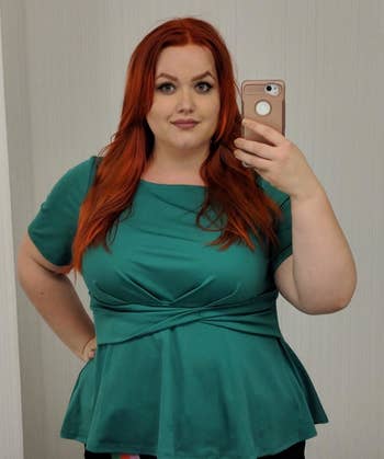 Promising review: "To be honest, I didn't have very high hopes for a shirt this inexpensive. But at that price point, I also figured that I didn't have much to lose. I'm busty and have tattoos on my shoulders, so finding cute, comfortable clothing that's suitable for work and doesn't break the bank can be a challenge. This shirt looks exactly like an Elloquii one I've been eyeing for a while, but at a fraction of the price. I'll probably get the other colors as well!" —Arden Bee