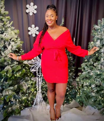 Promising review: "This sweater dress is perfect for any winter party. I have worn it twice - once to a fundraiser and once to my weekend job (restaurant hostess) — and I got stopped in both places by at least five women complimenting my outfit. This is a seriously good deal for a really cute dress. I wore heels both times, but you could also dress it down with some boots and tights. Definitely going to order in other colors! (My one minor complaint is that it is a little big on my chest - if you have a small chest like me, just expect it to be a bit looser on top. However, I was able to tighten everything up with the sash it comes with, so it ended up fitting really nicely." —AC