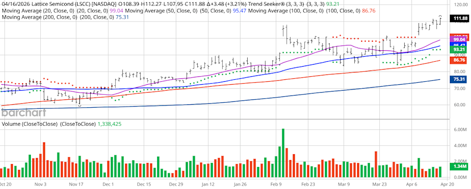 The above button links to Coinbase. Yahoo Finance is not a broker-dealer or investment adviser and does not offer securities or cryptocurrencies for sale or facilitate trading. Coinbase pays us for certain activity generated through this link. Prices displayed are informational. Lattice Semiconductor (LSCC) exhibits strong momentum and is trading at new all-time highs. The stock is up 169% over the past year. LSCC maintains a 100% “Buy” technical rating from Barchart. Valuation is stretched at a price-earnings ratio of 410x, although analyst sentiment remains mostly positive. Valued at $14.84 billion, Lattice Semiconductor (LSCC) designs, develops, and markets high performance programmable logic devices and related development system software. Programmable logic devices are standard semiconductor components that can be configured by the end customer as specific logic functions, enabling shorter design cycle times and reduced development costs. Profit Surged at TSMC. Why Is the Stock Still Falling After Earnings? Microsoft Stock Warning: Why Piper Sandler Analysts Just Slashed Their MSFT Price Target by More Than 15% Infleqtion Jumps on New Nvidia Quantum Computing Models. Should You Buy INFQ Stock for Q2? Markets move fast. Keep up by reading our FREE midday Barchart Brief newsletter for exclusive charts, analysis, and headlines. I found today’s Chart of the Day by using Barchart’s powerful screening functions to sort for stocks with the highest technical buy signals; superior current momentum in both strength and direction; and a Trend Seeker “buy” signal. I then used Barchart’s Flipcharts feature to review the charts for consistent price appreciation. LSCC checks those boxes. The Trend Seeker issued a new “Buy” signal on April 8. Since then, the stock has gained 4.99%. Editor’s Note: The technical indicators below are updated live during the session every 20 minutes and can therefore change each day as the market fluctuates. The indicator numbers shown below therefore may not match what you see live on the Barchart.com website when you read this report. These technical indicators form the Barchart Opinion on a particular stock. Lattice Semiconductor scored an all-time high of $112.27 on April 16. Lattice Semi has a Weighted Alpha of +163.67. LSCC has a 100% “Buy” opinion from Barchart. The stock has gained 169.01% over the past 52 weeks. Lattice Semi has its Trend Seeker “Buy” signal intact. The stock recently traded at $111.88 with a 50-day moving average of $95.47. LSCC has made 10 new highs and gained 24.42% over the past month. Relative Strength Index (RSI) is at 65.88. There’s a technical support level around $109.13. $14.84 billion market capitalization. 410.41x price-earnings ratio. Analysts project an increase in revenue of 33.47% this year and another 17.22% next year. Earnings are estimated to increase 49.80% this year and an additional 28.22% next year. The Wall Street analysts followed by Barchart give the stock 9 “Strong Buy,” 3 “Moderate Buy,” 2 “Hold” and 1 “Sell” opinion with price targets between $85 and $135. Value Line rates the stock “Above Average” with3-5-year price targets between $90 and $135. CFRA’s MarketScope rates the stock a “Hold.” Morningstar thinks the stock is 24% overvalued with a fair value of $87.32. 13,150 investors are following the stock on Seeking Alpha, which rates it a “Hold.” Short interest is 4.17% of the float with 3.40 days to cover the float. The stock seems to be firing on 4 out of 5 cylinders. Growth, profits, momentum, and analyst revisions all seem great, but that valuation is pretty rich. However, Wall Street and analysts seem happy. Additional disclosure: The Barchart Chart of the Day highlights stocks that are experiencing exceptional current price appreciation. They are not intended to be buy recommendations as these stocks are extremely volatile and speculative. Should you decide to add one of these stocks to your investment portfolio it is highly suggested you follow a predetermined diversification and moving stop loss discipline that is consistent with your personal investment risk tolerance. On the date of publication, Jim Van Meerten did not have (either directly or indirectly) positions in any of the securities mentioned in this article. All information and data in this article is solely for informational purposes. This article was originally published on Barchart.com
