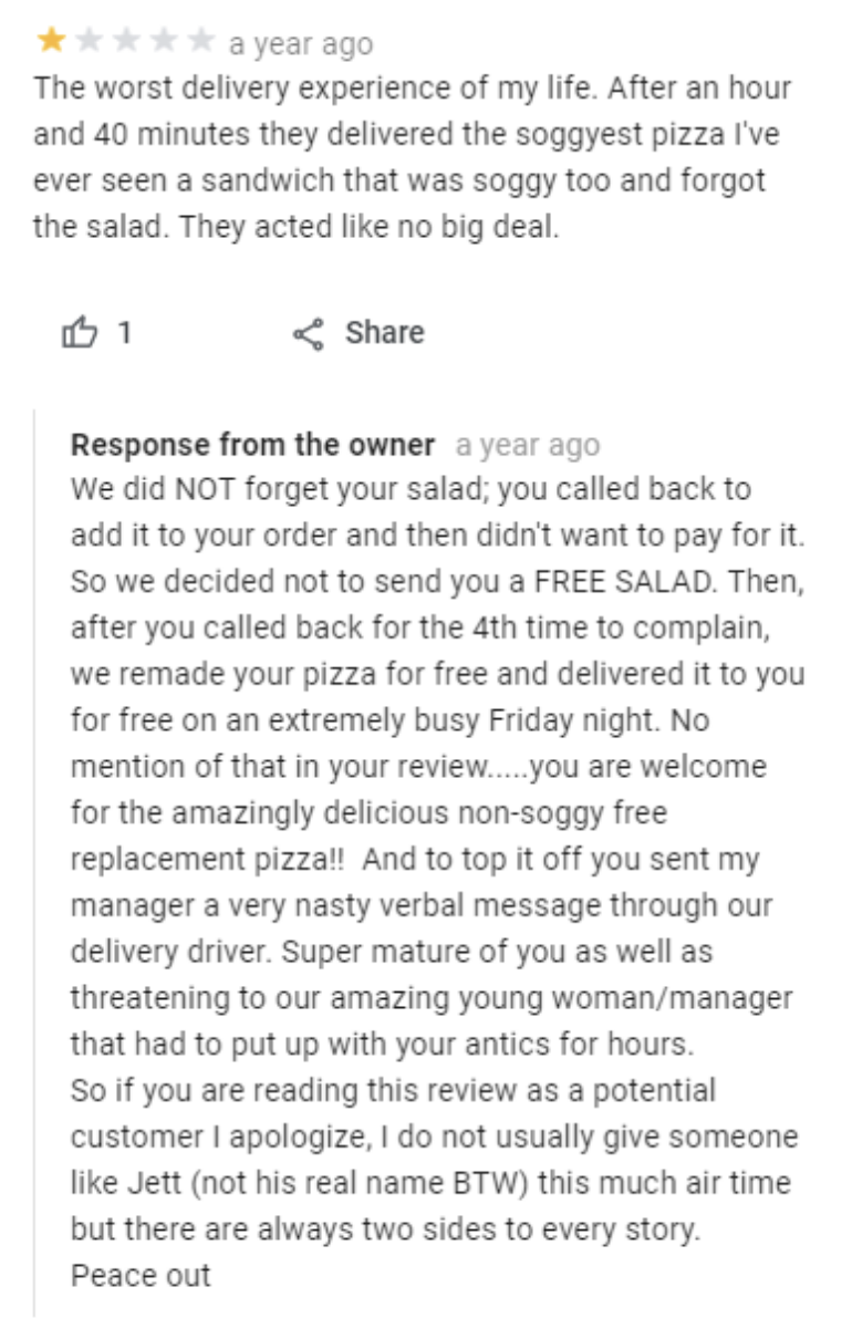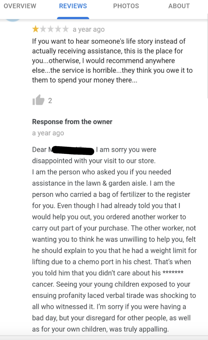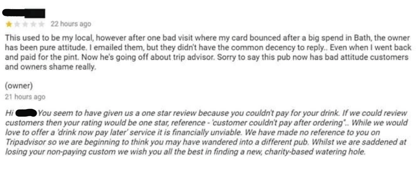“If we could review customers, then your rating would be one star: customer couldn’t pay after ordering. While we would love to offer a ’drink now, pay later’ service, it is financially unviable. While we are saddened at losing you as a non-paying customer, we wish you all the best in finding a new, charity-based watering hole.” I'm the AAPI Culture Editor here at BuzzFeed, where I cover everything from trending news to pop culture to AAPI issues. Customer: "This used to be my local, however, after one bad visit where my card bounced after a big spend in Bath, the owner has been pure attitude. I emailed them, but they didn't have the common decency to reply. Even when I went back and paid for the pint...Sorry to say, this pub now has bad attitude, customers, and owners. Shame, really." Owner: "You seem to have given us a one-star review because you couldn't pay for your drink. If we could review customers, then your rating would be one star, reference 'customer couldn't pay after ordering.' While we would love to offer a 'drink now, pay later' service, it is financially unviable...Whilst we are saddened at losing your non-paying custom, we wish you all the best in finding a new, charity-based watering hole."