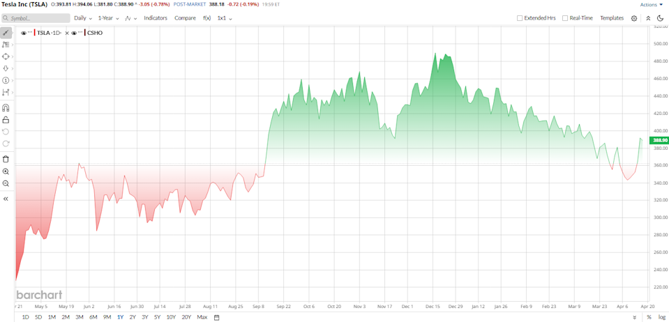 The above button links to Coinbase. Yahoo Finance is not a broker-dealer or investment adviser and does not offer securities or cryptocurrencies for sale or facilitate trading. Coinbase pays us for certain activity generated through this link. Prices displayed are informational. Electric vehicle (EV) stocks often move on delivery trends, margins, and the pace of demand. Tesla (TSLA), however, has long been more than just an automaker. It is also an AI and autonomy story, with investors watching every step the company takes toward self-driving technology and in-house chip design. That is why Tesla’s latest milestone matters. CEO Elon Musk recently said the company has taped out its AI5 chip, a key step before manufacturing begins. The move adds another layer to Tesla’s long-term case, especially as the company pushes toward Full Self-Driving (FSD), robotaxis, and other AI-driven products. For investors trying to decide whether TSLA stock is a buy, sell, or hold, the new chip development adds fresh fuel to an already important debate. Tesla Earnings, Hormuz and Other Key Things to Watch this Week Netflix Generates Massive FCF and FCF Margins - NFLX Price Targets Are Higher Profit Jumped 58% at Taiwan Semi. Does That Make TSM Stock a Buy Here? Stop Missing Market Moves: Get the FREE Barchart Brief – your midday dose of stock movers, trending sectors, and actionable trade ideas, delivered right to your inbox. Sign Up Now! TSLA stock has been on a bumpy ride lately. Shares jumped sharply in mid-2025 on election-related optimism, but this year has been uneven. Shares of Tesla fell about 10% in January as Chinese EV competition intensified, then rebounded in March on hopes for better FSD progress. Tesla is down roughly 13% year-to-date (YTD) despite an 11% gain over the past five days on the tape-out news. Technically, TSLA is trading near its 50-day moving average, while the 200-day average is still above the current price, indicating the stock hasn’t broken out of its downtrend. Despite the volatile movement, one thing about Tesla has remained unchanged: its rich valuation. For example, the forward price-to-earnings (P/E) ratio is 280 times, vastly above the sector median, suggesting overpricing compared to peers. By contrast, legacy automakers trade at P/E mulitples in the low double digits or EV/EBITDA in the teens. Tesla’s EV/EBITDA is above 100 times, well above its 10-year median. In short, TSLA stock isn’t cheap as it prices in big wins from AI, autonomy, and new products. Bulls argue that Tesla’s future growth justifies a premium, but on typical metrics it’s rich relative to peers. On April 15, Musk said that Tesla had taped out its AI5 chip. In chipmaking, a tape-out means the design is finished and sent to the factory. It is an important step, but it is not the same as shipping finished products. Tesla is working with Taiwan Semiconductor Manufacturing (TSM) on AI5. A future AI6 chip is planned for Samsung’s 2-nanometer line, although that program has already seen delays. Musk believes AI5 could enter high-volume production in 2027, and Tesla has also said it will need hundreds of thousands of chips before switching production to the new hardware. That means the AI5 chip is a strategic win, but not a short-term earnings driver. Tesla heads into its April 22 earnings report with Wall Street looking for more than a simple bottom-line beat. Current Wall Street estimates sit around $0.21 per share on revenue of about $22.7 billion, while Tesla’s own recent delivery report showed its weakest quarterly deliveries in a year as U.S. incentives faded and competition stayed intense. The bigger focus for investors will be on margins, inventory, capital spending, and the company’s comments on FSD, robotaxis, and Optimus. Tesla’s latest delivery report showed more vehicles produced than delivered, and several analysts say investors want clearer signs that the AI and autonomy story is turning into actual operating progress. Options traders are bracing for a meaningful move. Options data show an implied swing of about 6% into earnings, while another market readout points to roughly 7%. That suggests the market expects a sharp reaction even if results are only slightly different from forecasts. For investors, the key question is whether Tesla can show that the fourth-quarter strength in margins and cash flow was more than a one-quarter lift. Tesla’s leadership believes the future is not just cars. CEO Elon Musk called 2025 a key year as the company widened its focus to include AI and robotics. Musk pointed to Optimus, Cybercab, and FSD as central parts of the plan. That strategy also means higher spending. CFO Vaibhav Taneja said that Tesla expects more than $20 billion in capital expenditures in 2026 as it ramps up factories and chip work. The company has not offered formal full-year guidance, but analysts expect near-term pressure from these investments. Tesla’s moves so far this year clearly show that shift. In March, the company and SpaceX unveiled plans for a $25 billion chip factory in Austin, Texas. Tesla also said that its Shanghai facility will be important for Optimus production, while Fremont is being retooled to make room for robots. In China, stronger competition from local EV makers has also added pressure. Analysts remain divided on TSLA stock. The consensus rating is a “Hold,” with the average 12-month target at $400.58. That suggests minimal potential upside, with the stock currently trading near $391. Some bullish analysts stress Tesla’s long-term vision. For instance, Morgan Stanley has an “Equal Weight” rating and a $415 target, noting Tesla’s expanding advantage in autonomy. Analysts argue that progress on unsupervised FSD is key to justifying the price. Similarly, Deutsche Bank analyst Edison Yu maintained a “Buy” rating and a $465 target, impressed by Tesla’s robotaxi and autonomy tech, though he flagged work needed on routing effi