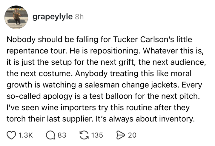 In the hours after conservative commentator Tucker Carlson apologized for voicing support for President Donald Trump during the 2024 election, social media users seemed divided on whether Carlson was telling the truth. Reactions ran quite the gamut: Carlson now joins other conservative public figures like Megyn Kelly, Joe Rogan, Alex Jones and Candace Owens, who have cut ties with the president. Carlson endorsed Trump for the 2024 presidential election and interviewed the president when Trump chose to skip the first Republican primary debate in August 2023. Not everyone was convinced by Carlson’s apology, which Cindy Frantz, a social psychologist at Oberlin College, said is to be expected for a public figure. “Whenever a public figure apologizes, there’s always a bunch of people who say it isn’t sincere, it isn’t a real apology,” Frantz said. “In part, that’s because there are so many mixed motives why somebody might be apologizing, [and] it’s really hard for people to know what to think or to be able to really tell with any certainty why they’re apologizing.” Frantz, who has studied how timing can impact apology effectiveness, noted that a lot of public apologies do not take responsibility: “So often, the apologies are like, ‘I’m sorry people were offended’ or ‘I’m sorry my intention was misunderstood’” — but Carlson did seem to take responsibility more explicitly than others. “You and I and everyone else who supported him — you wrote speeches for him, I campaigned for him — I mean, we’re implicated in this for sure,” Carlson said to his brother, Buckley Carlson, in Monday’s episode of “The Tucker Carlson Show.” Buckley confirmed on the podcast that he wrote speeches for Trump during his 2016 presidential campaign. “I want to say I’m sorry for misleading people,” Carlson told listeners. “It was not intentional.” A big determining factor could be whether they actually watched the podcast video. Susan Constantine, a body language expert, told HuffPost: “He goes from introspective to performative. He jumps back and forth, so that’s why people are getting mixed messages — because he’s giving you two mixed messages.” Constantine, who watched multiple older videos of Carlson to get a sense of his normal body language, flagged that Carlson’s language is also mixed messaging. “He also moves from ‘I’ to ‘we’ at the very beginning,” Constantine said. “He says, ‘It wasn’t just me, we all did this.’” When Carlson presses his lips together and crosses his arms, it could indicate he’s reflecting on the situation and what he’s saying, Constantine said. But then there are times when he transitions into looking up to the ceiling and starts to laugh, which could convey that he’s dismissing his comments as serious. The back-and-forth is “basically saying that he’s holding something back,” Constantine said. “He’s continuing to go through some sort of internal disagreement, or he’s restraining himself from saying something.” Two missing pieces could have helped sell Carlson’s apology, Frantz argues. For one, Carlson did not mention any action for making amends for what he regrets. “I think what really undercuts his apology is that a lot of people could reasonably infer you could have and should have and probably did know all of this, and you did it,” Frantz said. “There’s no effort to make amends, not much effort to really acknowledge the enormity.” The other element is one neither Carlson nor the general public can fix: There’s no interpersonal relationship here. Carlson is a public figure in front of a camera — there are too many barriers for people to trust what he’s saying. “There are all kinds of clues that we can get in face-to-face interactions with somebody that we know reasonably well, or someone who we interact with regularly, that can help us develop some confidence that the person really means [their apology],” Frantz said. “That’s kind of impossible in a public apology.” That lack of personal relationship is also why social media users instinctively search for ulterior motives rather than taking him at his word. Many have speculated that Carlson had an ulterior motive for his apology, ranging from prioritizing his income to running for office. (Carlson has not formally announced any political campaigns. As of reporting, Carlson’s team has not responded to HuffPost’s request for comment.) Simply writing the apology or only releasing the audio of the podcast recording wouldn’t have solved the confusion, either, Constantine said. “He says, ‘I want to say sorry,’ he doesn’t say, ‘I’m sorry,’” she said. “He’s actually distancing himself from any sort of direct ownership of it.” In an April 6 podcast episode, Carlson called out Trump’s Truth Social post on Easter morning, in which the president wrote, “Tuesday will be Power Plant Day, and Bridge Day, all wrapped up in one, in Iran. There will be nothing like it!!! Open the Fuckin’ Strait, you crazy bastards, or you’ll be living in Hell – JUST WATCH! Praise be to Allah.” “Who do you think you are?” Carlson asked. “You’re mocking the religion of Iran. … No president should mock Islam. That’s not your job. This is not a theocracy.” In March, Carlson told Status’ Oliver Darcy, “There are times I get annoyed with Trump, right now definitely included, but I’ll always love him no matter what he says about me.” Court filings made public in March 2023 revealed that the then-Fox News host said he “passionately” hated Trump in a text message to an unnamed recipient in January 2021. “We are very, very close to being able to ignore Trump most nights. I truly can’t wait,” Carlson texted. “I hate him passionately. I can’t handle much more of this.” By entering your email and clicking Sign Up, you're agreeing to let us send you customized marke