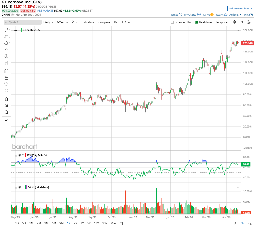 The above button links to Coinbase. Yahoo Finance is not a broker-dealer or investment adviser and does not offer securities or cryptocurrencies for sale or facilitate trading. Coinbase pays us for certain activity generated through this link. Prices displayed are informational. Shares of GE Vernova (GEV) have delivered exceptional performance, rising more than 51% year-to-date (YTD) and over 217% in the past 12 months. This rally reflects sustained demand for electrification, grid modernization, and cleaner energy solutions. The company provides power generation equipment, grid technologies, and energy storage systems and is witnessing significant demand for its offerings, driven by ongoing investment in artificial intelligence (AI) infrastructure, primarily in data centers. At the same time, the shift toward electric transportation and the electrification of commercial buildings is pushing overall electricity consumption higher, supporting its growth. Alphabet Q1 Earnings Preview: Is GOOGL Stock a Buy, Sell, or Hold? Morgan Stanley Says Palantir Stock Can Keep Accelerating Revenue Growth. Load Up on PLTR Here. Qualcomm Just Increased Its Dividend. Should You Buy QCOM Stock Here? Tired of missing midday reversals? The FREE Barchart Brief newsletter keeps you in the know. Sign up now! Now, as GE Vernova is scheduled to release its first-quarter earnings on April 22, expectations remain high. Robust end-market demand, a steadily expanding order backlog, and earnings improvement are likely to support its growth. Analysts broadly maintain a bullish outlook on GEV stock heading into the earnings announcement, with at least one projecting a 12-month price target of $1,225, implying about 24% upside from its recent closing price of $990.18. There is also optimism based on the stock’s past behavior. Historically, GE Vernova shares have risen after earnings reports, posting an average gain of around 7% over the past four quarters. While past trends don’t guarantee future results, this pattern adds to expectations of a favorable market reaction if the company delivers strong results. GE Vernova is expected to post a strong first quarter, supported by steady demand for both equipment and services and favorable pricing. Broader structural trends, such as rising global electricity consumption driven by industrial growth, electrification, and expanding data centers, continue to strengthen demand across its end markets. A major signal of this momentum is the company’s backlog, which reached $150 billion in 2025. This growth highlights consistent order inflows, particularly in the Power and Electrification segments. Customers ranging from utilities to industrial firms and large technology companies are increasing investments to meet escalating energy needs, strengthening GEV’s growth trajectory. In the Power segment, performance remains driven by equipment sales and services. Utilities are investing in new capacity and upgrading existing infrastructure to boost efficiency and reliability. Strong demand for gas power equipment in the U.S. has further lifted backlog levels and increased production slot reservations, suggesting continued order strength in the near term. At the same time, the services business within the Power segment remains strong. By the end of the fourth quarter, its backlog stood at $70 billion, supported by gas-related service agreements with favorable pricing. The shift toward long-term service contracts is improving earnings quality by generating recurring, higher-margin revenue and providing better visibility into future performance. Looking ahead to Q1 2026, management remains optimistic about the Power segment. Gas equipment orders are expected to rise, while overall segment revenue is projected to grow in the high single digits, supported by equipment deliveries and services. The Electrification segment is also benefiting from solid demand for grid and data center equipment. Its backlog has climbed to $35 billion, up $11 billion from the previous year. For Q1, continued strength in orders and solid margins are anticipated. In contrast, the Wind segment is still recovering. Although orders improved in the fourth quarter, near-term revenue is expected to decline. Overall, GE Vernova is projected to deliver strong financial results. Its earnings are projected to increase by 96.7% to $1.79 per share in Q1, driven by higher volumes, better pricing, and a growing contribution from services. GE Vernova is expected to deliver solid growth in Q1, driven by electrification and energy transition trends. Its solid backlog, rising high-margin service revenues, and long-term agreements augur well for growth. GEV stock has the potential to jump about 24% and reach $1,225 over the next year. Strong order inflows, margin expansion, and positive forward guidance will likely support the ongoing rally. However, note that the market has already priced in a significant portion of the growth story after the stock’s sharp run over the past year. GEV stock has a “Strong Buy” consensus rating ahead of the Q1 earnings release. On the date of publication, Amit Singh did not have (either directly or indirectly) positions in any of the securities mentioned in this article. All information and data in this article is solely for informational purposes. This article was originally published on Barchart.com