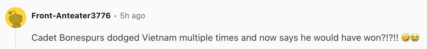 I'm the AAPI Culture Editor here at BuzzFeed, where I cover everything from trending news to pop culture to AAPI issues. BTW, the US and Israel launched strikes against Iran on Feb. 28. So, it's been nearly two months. Not sure where he's getting five months from. Note: This comment references Trump's multiple draft deferments during the Vietnam War (four for college education and one for bone spurs). You can read more about that here.