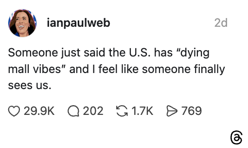 “Someone just said the U.S. has ’dying mall vibes’ and I feel like someone finally sees us.” I'm a Costa Rican-American writer covering all the impolite dinner party topics — religion, politics, witches, identity, Da Pope, and the internet.