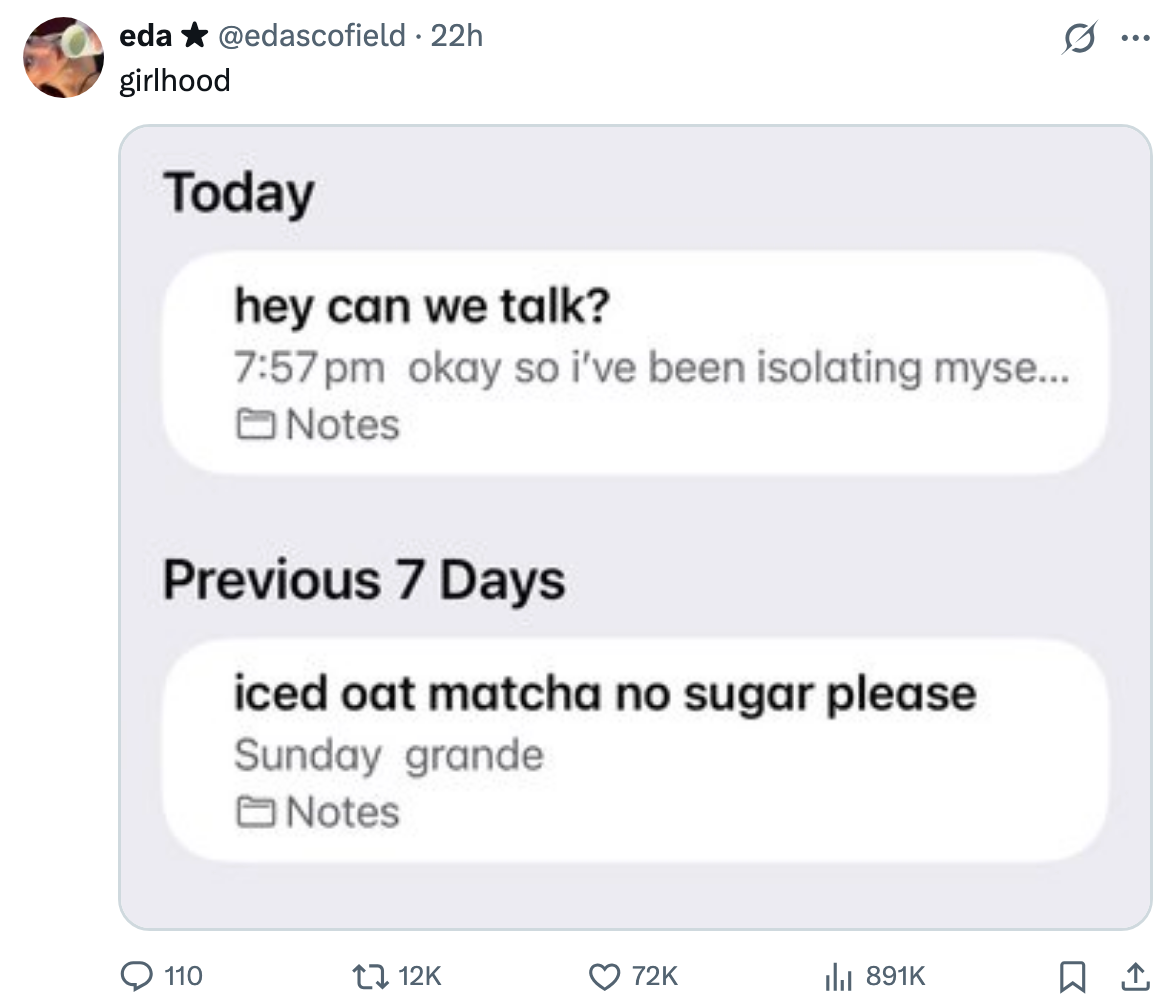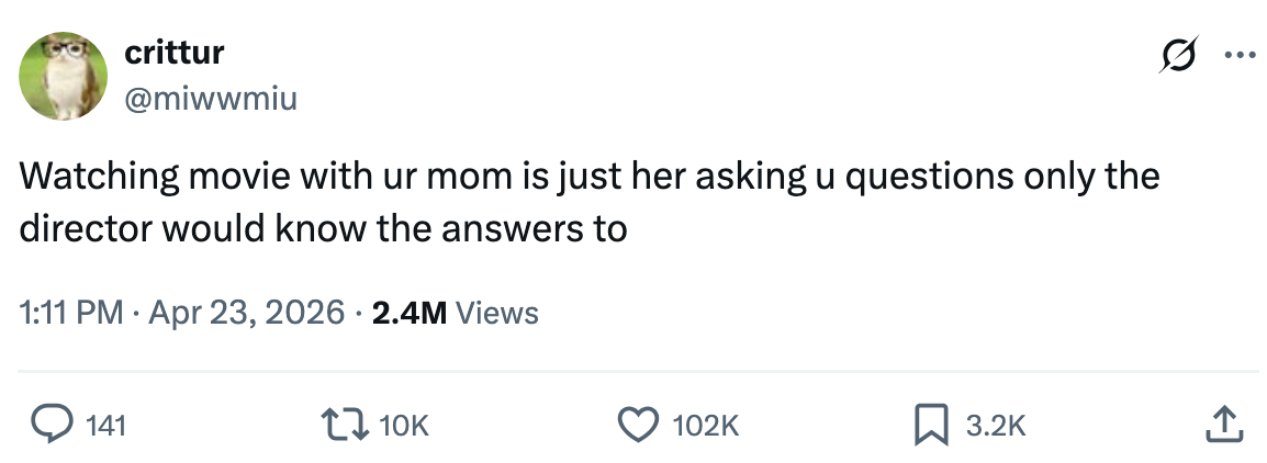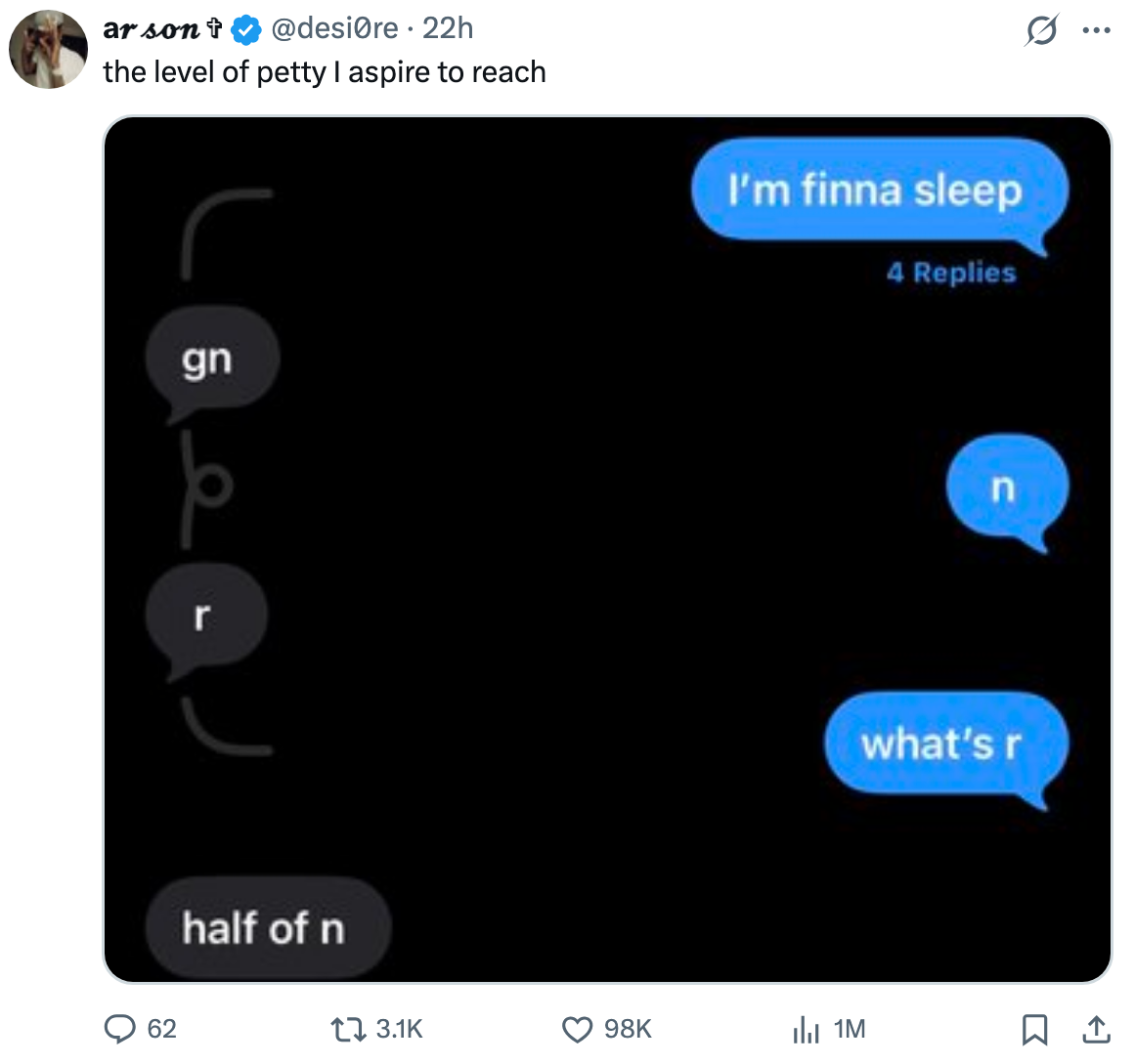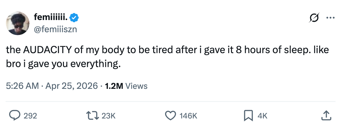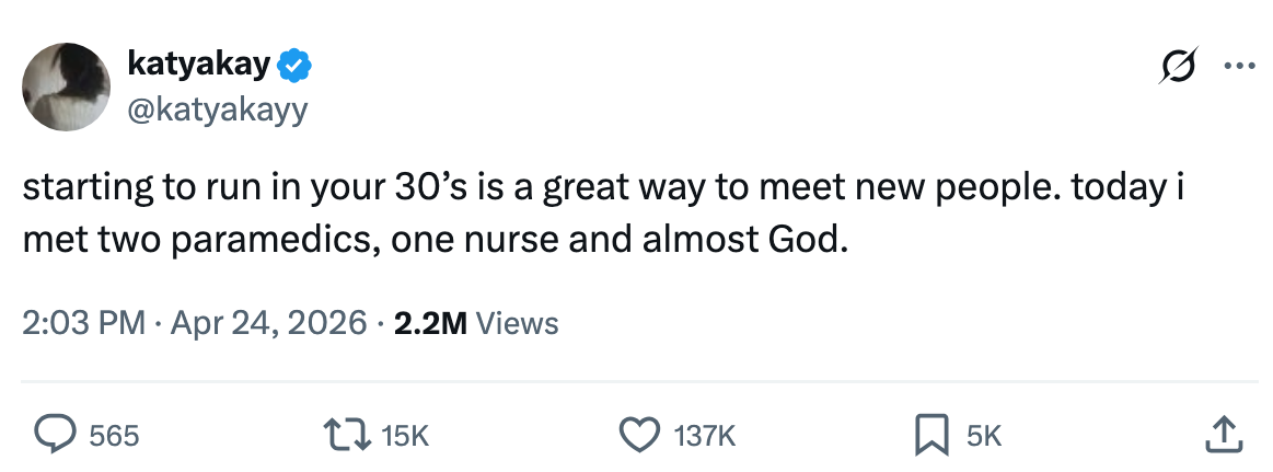 “starting to run in your 30’s is a great way to meet new people. today i met two paramedics, one nurse and almost God.” I'm Chelsea, the Weekend Editor at BuzzFeed, where I cover everything from pop culture and politics to TV and celebrity news. Editor's Note: While we can't endorse what X has become, we can bring you the worthwhile moments that still exist there, curated and free of the surrounding chaos. Also, make sure to follow these users if you like their tweets! Me outside of my moms room at 9pm to tell her I need a poster board for tomorrow: pic.twitter.com/U02PBrMzMD me with the laundry from the dryer https://t.co/US0lPMjhBA *i’m not picky*me after seeing the menu pic.twitter.com/PHejo99rWi me ready to crash out because i can still feel the oil on the plastic container after the 5th wash: pic.twitter.com/PyPlPJbxNF