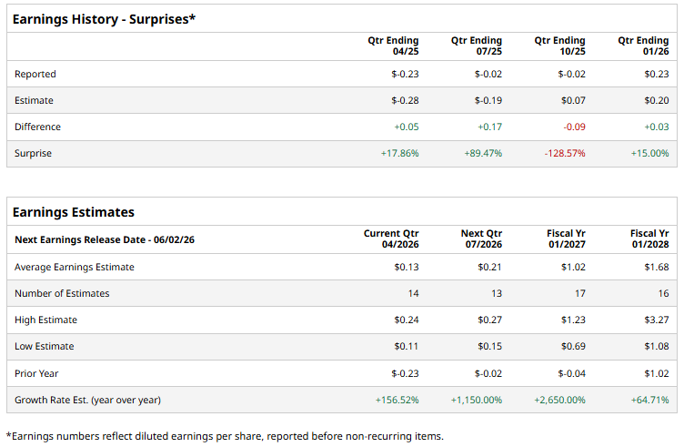 The above button links to Coinbase. Yahoo Finance is not a broker-dealer or investment adviser and does not offer securities or cryptocurrencies for sale or facilitate trading. Coinbase pays us for certain activity generated through this link. Prices displayed are informational. Headquartered in Austin, Texas, CrowdStrike Holdings, Inc. (CRWD) is a prominent cybersecurity company that provides cloud-native endpoint protection, threat intelligence, and incident response services. Founded in 2011 and with a market capitalization of $113.7 billion, the company is best known for its Falcon platform, which secures endpoints such as laptops, servers, and cloud workloads using artificial intelligence and real-time data analytics. CRWD is expected to release its Q1 earnings soon. Ahead of this release, analysts expect the cybersecurity giant to report a profit of $0.13 per share, up 156.5% from a loss of $0.23 per share reported in the year-ago quarter. It has exceeded analysts' earnings estimates in three of the past four quarters, while missing on one occasion. Mega-Cap Earnings, FOMC and Other Key Things to Watch this Week Better Later Than Never? Tesla Stock Hangs in the Crosshairs as Cybercab Finally Enters Production Intel Could Still Be Undervalued Based on Strong Free Cash Flow Our exclusive Barchart Brief newsletter is your FREE midday guide to what's moving stocks, sectors, and investor sentiment - delivered right when you need the info most. Subscribe today! For fiscal 2027, analysts expect CRWD to report a loss per share of $1.02, up 2,650% from a loss of $0.04 in fiscal 2026. CRWD stock has surged 8.2% over the past 52 weeks, underperforming the S&P 500 Index’s ($SPX) 30.6% uptick and the Technology Select Sector SPDR Fund’s (XLK) 56% surge during the same time frame. On Apr. 21, shares of CrowdStrike climbed 4.1% after KeyBanc Capital Markets upgraded the stock from “Hold” to “Buy” and issued a $525 price target. The upgrade reflects optimism that rising cybersecurity budgets, partly driven by advancements like Anthropic’s Mythos AI model, will benefit CrowdStrike, with its Falcon platform well-positioned to capture increased enterprise demand. Further, analysts remain somewhat bullish about CRWD stock’s future prospects, with a "Strong Buy" rating overall. Among 49 analysts covering the stock, 34 recommend a “Strong Buy,” three suggest a “Moderate Buy,” 11 suggest a “Hold,” and one advises a “Strong Sell.” Its mean price target of $492.39 implies an upswing potential of 9.9% from the current market prices. On the date of publication, Kritika Sarmah did not have (either directly or indirectly) positions in any of the securities mentioned in this article. All information and data in this article is solely for informational purposes. This article was originally published on Barchart.com