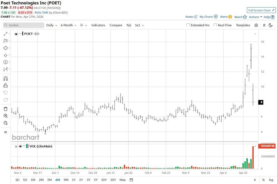 The above button links to Coinbase. Yahoo Finance is not a broker-dealer or investment adviser and does not offer securities or cryptocurrencies for sale or facilitate trading. Coinbase pays us for certain activity generated through this link. Prices displayed are informational. POET Technologies (POET) shares crashed on Monday after Marvell (MRVL) canceled all purchase orders it had previously placed with the technology company. POET’s chief of finance, Thomas Mika, recently mentioned Marvell as a key customer. However, Marvell has claimed that POET breached a strict non-disclosure agreement (NDA) in revealing details of the purchase order. Amazon's Chip Business Is Bigger Than AMD, Could Soon Pass Broadcom, Intel Micron Stock Keeps Soaring, as Investors Make Unusually Heavy MU Option Trades Stocks Set for Muted Open as Investors Await Big Tech Earnings and Fed Meeting; Middle East Developments in Focus Our exclusive Barchart Brief newsletter is your FREE midday guide to what's moving stocks, sectors, and investor sentiment - delivered right when you need the info most. Subscribe today! Following today’s plunge, POET Technologies stock is down more than 45% versus its recent high. The Marvell news is meaningfully bearish for POET shares, given it creates a “significant revenue gap” for the firm’s current fiscal year, as its CFO noted on an emergency call today. In fact, it’s fair to argue that POET Technologies has been relegated to a speculative micro-cap name, still struggling to prove its commercial viability. More importantly, the MRVL setback is a reputational disaster for the POET — one that may make other semiconductor companies wary of teaming up with it in the future. And without a clear path to high-volume manufacturing with a major industry player, the fab-light model starts to look like a revenue-light reality for investors. Investors are recommended to exercise caution in buying the dip in POET Technologies shares also because the company’s fundamentals, more broadly, remain concerning in 2026. The Nasdaq-listed firm continues to struggle with a high cash burn rate and frequent equity dilutions that punish long-term holders. Despite the hype surrounding 800G and 1.6T optical transceivers, its financials show negligible trailing revenue, leading to an alarmingly lofty valuation of more than 1,400x sales. Even from a technical perspective, POET is trading just above its 20-day moving average (MA), with a decisive break below $7.80 expected to accelerate bearish momentum in the near term. Amid a lack of significant commercial contracts, looming threat of another capital raise, and giants like Broadcom (AVGO) and Nvidia (NVDA) developing in-house silicon photonics solutions, Wall Street analysts also favor keeping on the sidelines in POET stock. While the consensus rating on POET Technologies sits at a “Strong Buy,” the mean price target of $6.93 signals potential downside of another 13% from here. And downward revisions, reinforcing bearish sentiment, may follow Marvell’s announcement on April 27 as well. On the date of publication, Wajeeh Khan did not have (either directly or indirectly) positions in any of the securities mentioned in this article. All information and data in this article is solely for informational purposes. This article was originally published on Barchart.com