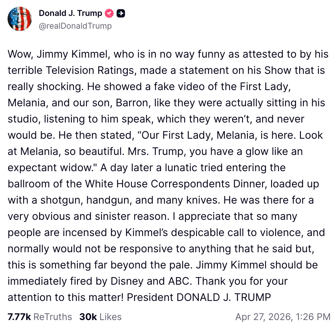Melania accused Kimmel of spreading “hate,” something which the president has never done. I'm a Senior Staff Writer at BuzzFeed covering pop culture, entertainment, and politics.