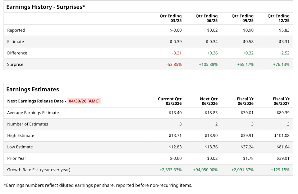 The above button links to Coinbase. Yahoo Finance is not a broker-dealer or investment adviser and does not offer securities or cryptocurrencies for sale or facilitate trading. Coinbase pays us for certain activity generated through this link. Prices displayed are informational. Valued at a market cap of $146.1 billion, Sandisk Corporation (SNDK) develops, manufactures, and sells data storage devices and solutions. The Milpitas, California-based company is expected to announce its fiscal Q3 earnings for 2026 after the market closes on Thursday, Apr. 30. Ahead of this event, analysts expect this tech company to report a profit of $13.40 per share, up 2,333.3% from a loss of $0.60 per share in the year-ago quarter. The company has topped Wall Street’s bottom-line estimates in three of the last four quarters, while missing on another occasion. In Q2, SNDK’s EPS of $5.83 outpaced the consensus expectations by a notable margin of 76.1%. Mega-Cap Earnings, FOMC and Other Key Things to Watch this Week Spirit Airlines Stock Is Ready for Takeoff Thanks to Trump, but Can This Plane Stay in the Sky? Intel Could Still Be Undervalued Based on Strong Free Cash Flow Tired of missing midday reversals? The FREE Barchart Brief newsletter keeps you in the know. Sign up now! For the current fiscal year, ending in June, analysts expect SNDK to report earnings of $39.01 per share, up 2,091.6% from $1.78 per share in fiscal 2025. Its EPS is expected to further grow 129.2% year-over-year to $89.39 in fiscal 2027. SNDK has skyrocketed 2,965.7% over the past 52 weeks, significantly outpacing both the S&P 500 Index's ($SPX) 30.6% return and the State Street Technology Select Sector SPDR ETF’s (XLK) 56% uptick over the same time period. On Mar. 26, SNDK declined 11% as investors reacted to the company's $1 billion strategic investment in Taiwan’s Nanya Technology. While the deal secures a critical 3.9% equity stake and a long-term DRAM supply agreement for AI infrastructure, shareholders were wary of the heavy capital expenditure and potential dilution. The sell-off was further intensified by broader market anxiety after Google unveiled a memory-saving algorithm that threatened future hardware demand. Wall Street analysts are highly optimistic about SNDK’s stock, with a "Strong Buy" rating overall. Among 21 analysts covering the stock, 16 recommend "Strong Buy," one indicates a "Moderate Buy,” and four suggest "Hold." While the company is trading above its mean price target of $916.47, its Street-high price target of $1,800 indicates an 81.8% potential upside from the current levels. On the date of publication, Neharika Jain did not have (either directly or indirectly) positions in any of the securities mentioned in this article. All information and data in this article is solely for informational purposes. This article was originally published on Barchart.com