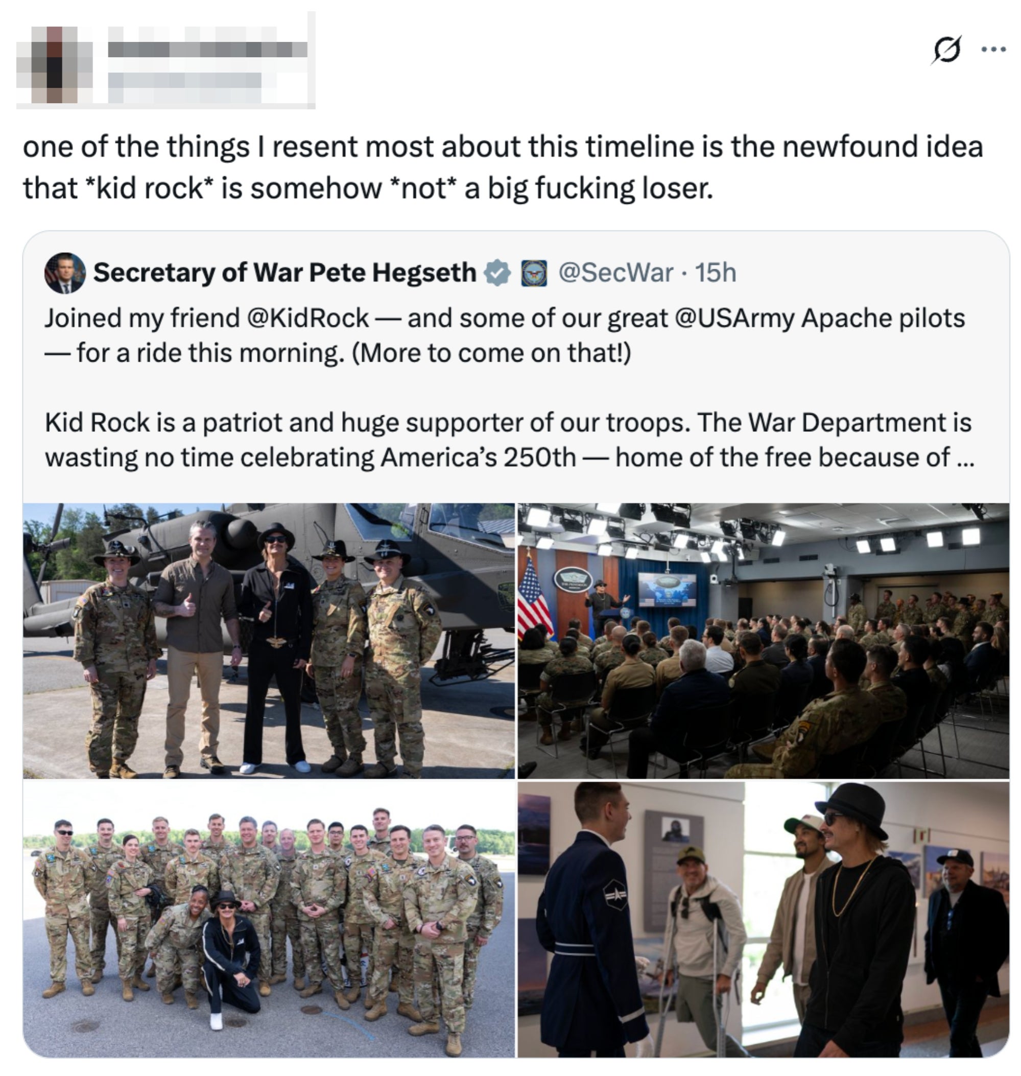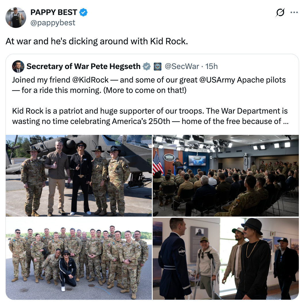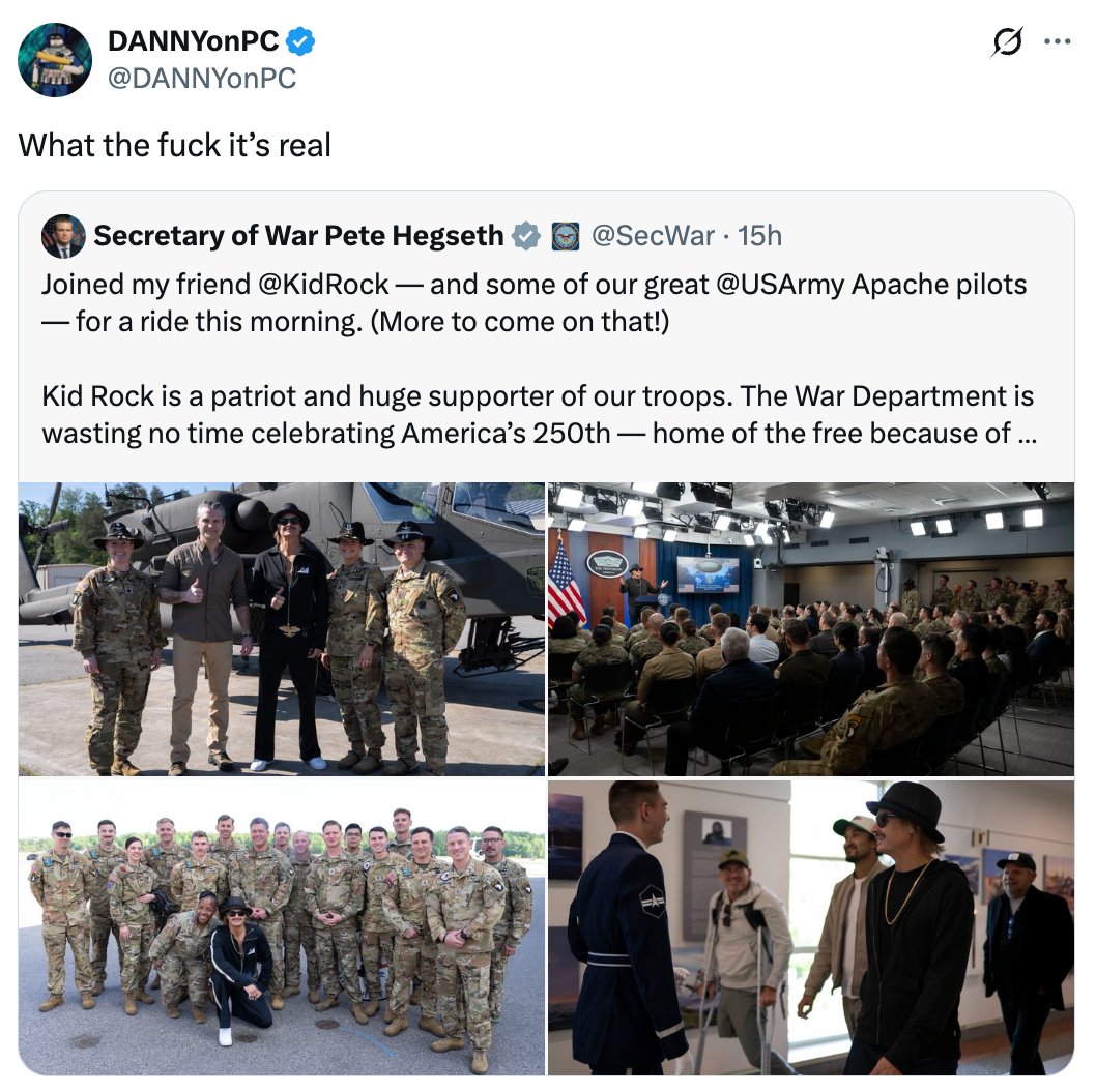 “It’s getting more difficult each day to tell what’s real and what’s parody.” Note: I can't find anywhere that Kid Rock discussed the Strait of Hormuz, but then again, would you even be surprised?