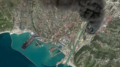 A major Russian oil refinery on the Black Sea has been hit for the third time this month by Ukrainian drones, causing a "massive fire" and forcing the evacuation of people living nearby, local officials have said. Earlier strikes in the past two weeks at the Tuapse refinery caused a big oil spill in the sea and residents reported "black" rain falling on the city and leaving an oily residue everywhere. The Kremlin accused Ukraine of "further increasing the oil shortage in global energy markets... and provoking further destabilisation". Ukraine's military confirmed the latest drone strike, saying such refineries helped fund Russia's full-scale invasion launched in 2022. More than 160 firefighters were deployed to extinguish the blaze, Krasnodar regional governor Veniamin Kondratyev said on Tuesday. No casualties were reported. In a post on Telegram on Tuesday morning, Kondratyev said firefighters and other rescuers were working in "extremely difficult conditions", and he described their efforts as "true heroism". "Our top priority is preserving the lives and health of city residents and visitors," he added. The head of the local municipal district, Sergei Boyko, asked residents of nearby streets to leave and reports said a temporary evacuation centre had been set up in a local school. Meanwhile, the regional crisis centre warned that "due to the severe fire, combustion products are being released into the atmosphere". Residents were urged to wear masks and rinse their nose, eyes and throat, as well as keep windows closed and limit time outdoors. Anastasia Troyanova, a local correspondent for environmental news outlet Kedr, described "a huge cloud of black smoke over the town; it smells of burning". In Moscow, Russian President Vladimir Putin ordered the country's emergencies minister to fly to Tuapse urgently to oversee firefighting and cleanup efforts. Putin's spokesman Dmitry Peskov said that Ukraine had struck oil storage facilities intended for export operations, arguing that Kyiv was destabilising global energy markets. In a statement, Ukraine's military confirmed it had again hit the Tuapse refinery, as part of concerted efforts to "reduce the military-economic potential of the Russian aggressor". In recent months, Ukraine's military has intensified its strikes on key energy facilities across Russia. Kyiv says they are legitimate targets, as they allow Russia to continue its war effort. In a separate development, one person was injured in a Russian drone attack on Kyiv, the capital's Mayor Vitaliy Klitschko said. Ukrainian officials also reported several fires, including one at a cemetery. Israel's foreign minister says it has received no evidence to support the claim that a vessel carrying grain from occupied Ukraine has reached Haifa. The 141m-long vessel, linked to a close ally of Russian President Vladimir Putin, cleared the waterway despite an ongoing blockade. Ethnic Tuareg fighters say they are in control of Kidal following a weekend of nationwide attacks, alongside Islamist groups. In a rare interview, Commander Robert Brovdi shared how his unit accounts for a third of all targets destroyed on the battlefield. Kim Jong Un and Russian Defence Minister Andrey Belousov unveiled the memorial in Pyongyang.