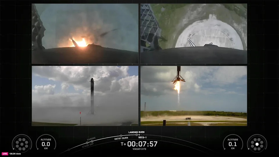 A triple-core SpaceX Falcon Heavy, the company's most powerful operational rocket, blasted off from Florida Wednesday, boosting a ViaSat internet satellite into space, the company's third in a globe-spanning fleet of high-speed broadband relay stations. Along with putting the ViaSat-3 satellite into its planned preliminary orbit, the rocket's two side boosters, heralded by competing sonic booms, executed on-target touchdowns on separate pads at the Cape Canaveral Space Force Station after boosting the vehicle out of the dense lower atmosphere. It was the 12th flight of a Falcon Heavy rocket since the booster's maiden launch in 2018 and the first since October 2024 when SpaceX sent NASA's Europa probe on the way to Jupiter. As expected, the heavy-lift rocket once again put on a spectacular show for area residents and tourists along Florida's Space Coast. Powered by 27 Merlin engines in three strapped-together Falcon 9 first stage boosters, the Falcon Heavy roared to life at 10:13 a.m. EDT and majestically climbed away from historic pad 39A at the Kennedy Space Center. Two minutes and 25 seconds after liftoff, the Heavy's two side boosters, both veterans of earlier flights, peeled away and headed back to the Cape Canaveral Space Force Station for landing while the central core stage continued the climb to space. A minute-and-a-half later, the core stage, making its first and only flight, fell away and the rocket's upper stage took over. Unlike the side boosters, which had propellant reserves for landing, the core stage burned all of its fuel as planned and was then jettisoned to crash into the Atlantic Ocean. Three upper stage engine firings were required to put the ViaSat-3 Flight 3 broadband satellite in an elliptical orbit that will allow the relay station's on-board propulsion to put the craft in a circular "geosynchronous" orbit 22,300 miles above the equator. SpaceX is actively building a constellation of Starlink satellites in low-Earth orbit that provide internet access by routing data from users to satellites passing overhead, which in turn relay the signals to and from ground stations. So far, the company has launched nearly 12,000 Starlinks in nearly 400 launches over the past seven years. Blue Origin also is building a planned constellation of some 3,200 broadband satellites in low-Earth orbit, with 270 launched to date. Amazon's LEO satellites eventually will compete head to head with SpaceX's Starlinks. ViaSat is taking a different approach, stationing larger, much more powerful and sophisticated satellites in geosynchronous orbit where they rotate in lockstep with the planet below and thus appear stationary in the sky, providing global space-based internet access on hemispheric scales. The powerful satellites are equipped with huge solar panels generating 25 kilowatts of power and stretching 144 feet from tip to tip when fully unfolded. Capable of handling up to 1 terabyte of data per second, the satellites are equipped with the largest dish antenna ever launched on a commercial satellite. Once on station, the huge reflector will unfold atop an 80- to 90-foot-long telescoping boom based on technology developed for the James Webb Space Telescope. California-based ViaSat built the relay station's communications equipment while Boeing supplied the satellite that carries it. A division of Northrop Grumman built the deployable reflector. The first ViaSat-3 satellite was launched in May 2023, but the antenna did not deploy properly and the spacecraft reportedly could only achieve about 10 percent of its 1-terabyte capability. A second ViaSat-3 satellite was launched atop a United Launch Alliance Atlas 5 rocket last November to provide service across the Americas. If all goes well, the latest ViaSat-3 will provide internet access to customers across Asia and the Pacific Ocean region. The first ViaSat will be moved to an orbital location enabling limited coverage of Europe and Africa. "It's kind of the end of an era. We've been working this program for over 10 years now," Dave Abrahamian, ViaSat's vice president of Satellite Systems, told Spaceflight Now. "So that's a good chunk of life that's gone by over the course of the program. "It's a different world now than when we started the program. Back then, we had a handful of satellites in orbit. Since then, we've launched the two ViaSat-3s, we merged with Inmarsat, we've got the third one ready to go now. So totally different world, different feeling, and its pretty cool to have been part of it all."